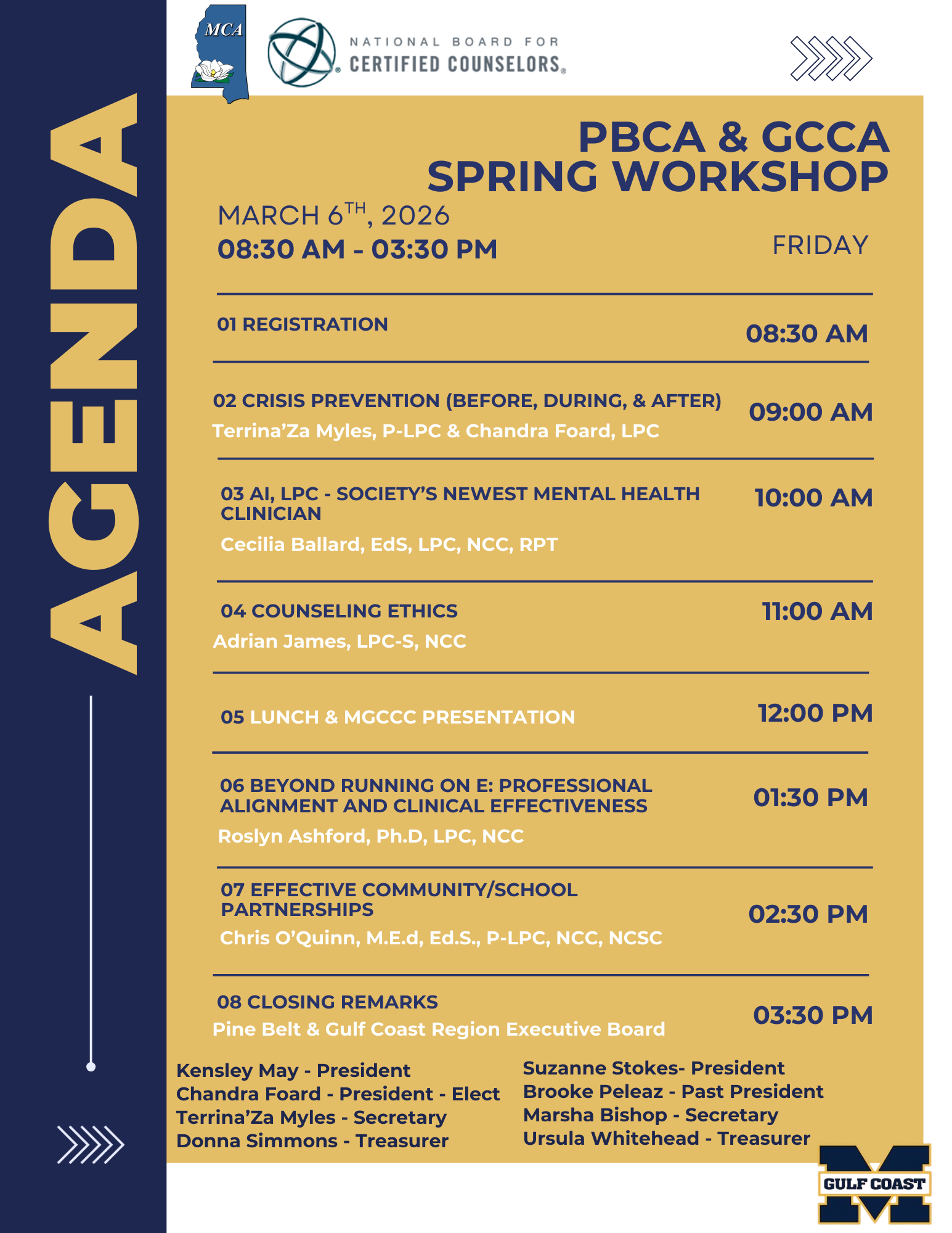 The Pine Belt & Gulf Coast Regions are hosting a spring workshop, scheduled for Friday, March 6, 2026, from 8:30 a.m. to 3:30 p.m. This workshop will be offered in a hybrid format, allowing participants to attend either in person at Mississippi Gulf Coast Community College – Perkinston Campus (51 Main Street, Perkinston, MS 39573) or virtually via Zoom. The registration fees are $25 for MCA members and $150 for non-members. During registration, participants will be asked to select their regional affiliation (Pine Belt or Gulf Coast) and indicate their attendance preference (in-person or virtual). This workshop is designed to provide relevant professional development, connection, and continuing education opportunities for counseling professionals across both regions. If you wish to register for this workshop, click the following link: